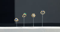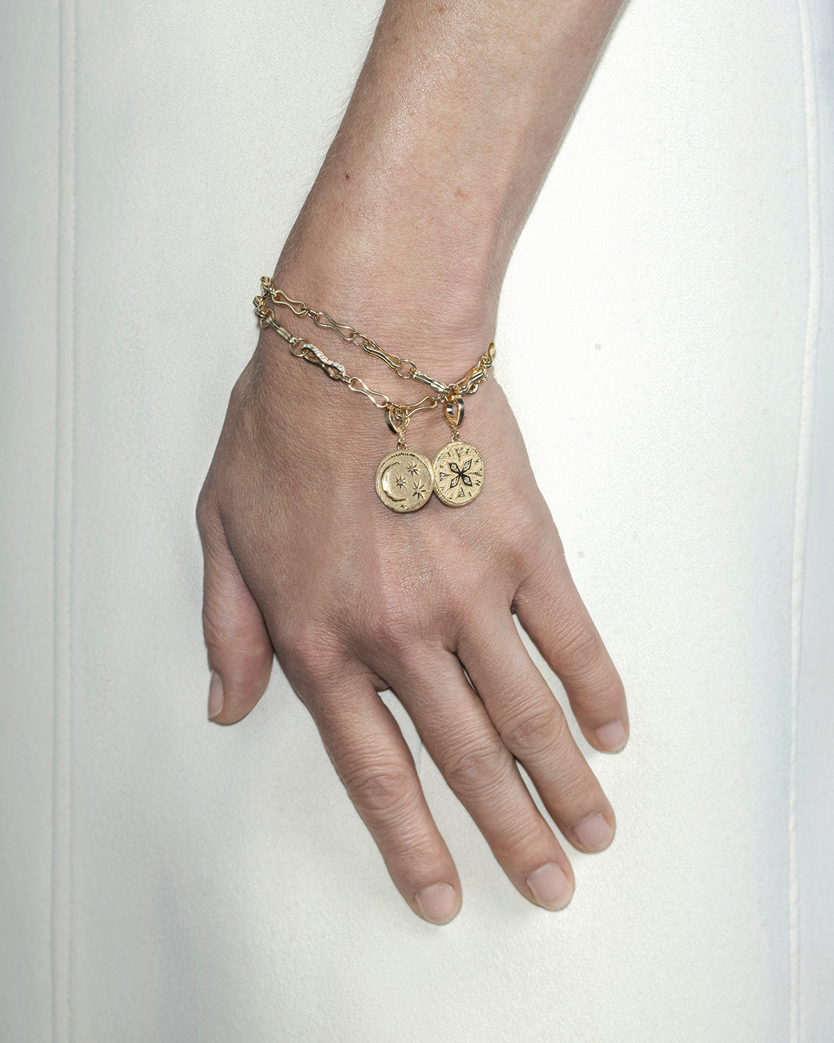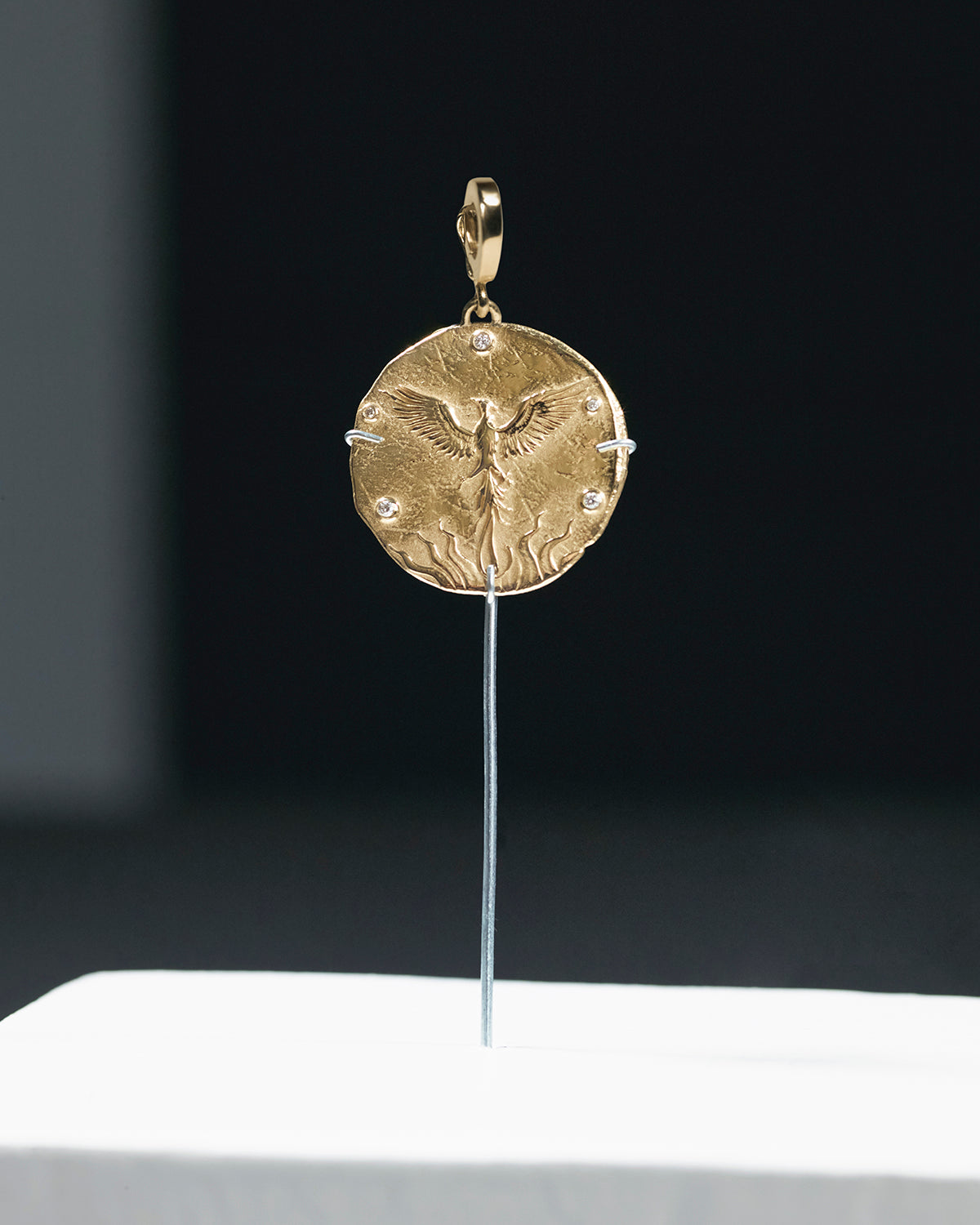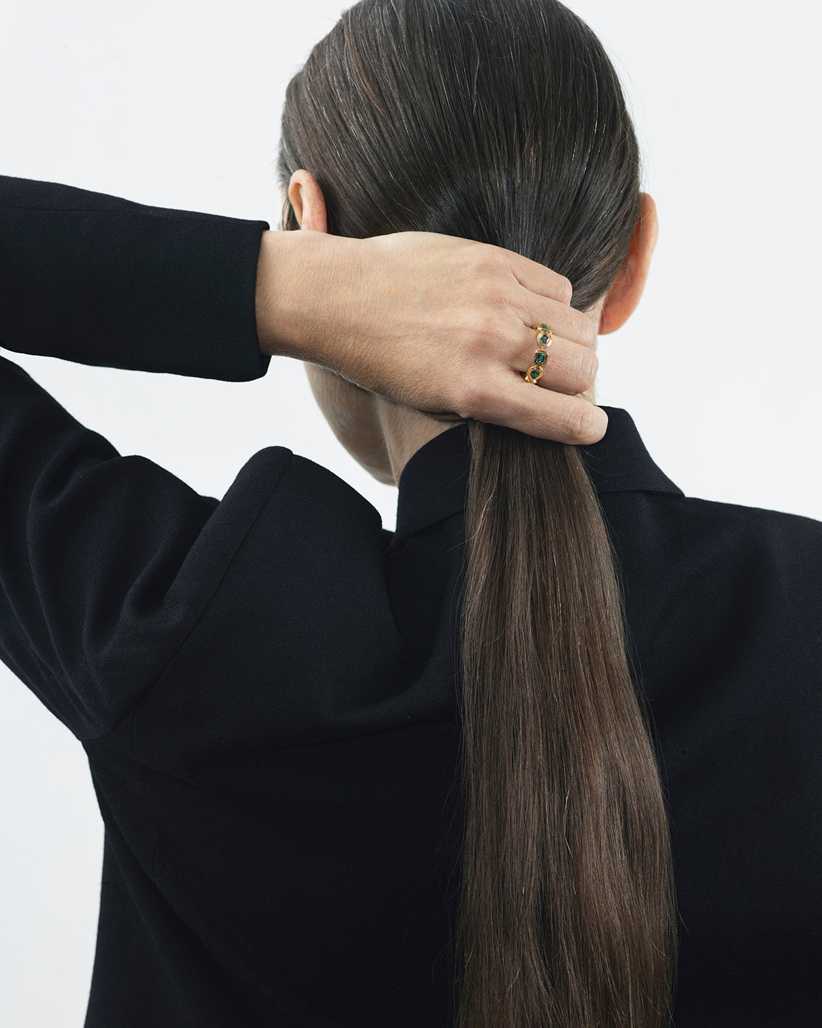 Earcuffs, bracelets, and rings are adorned with emeralds and sapphires in a chromatic crescendo — a celebration of color and movement, set in the signature Staircase pro- file. This sculptural foundation speaks to the architectural clarity that defines AZLEE’s design language, now explored through a more expressive lens. A new tactile texture, inspired by nature’s quiet transformation of raw materials over time — stone shaped by water, metal weathered by air — adds depth and softness to the collection’s surfaces. Three newly developed coins anchor the collection with universal symbols of evolution and transformation, extending the theme of renewal into talismanic form.