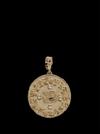 古代ギリシャの鳩が、豊かな古代の穀物に囲まれて、私たちの母なる自然を祝っています。北東南西に4つのダイヤモンドのアクセント