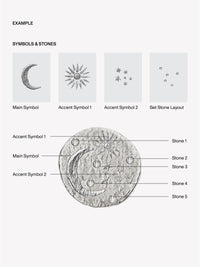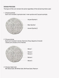Clients can choose a main symbol, and two accent symbols from our library of ancient & modern symbols. Then to accent the coin clients can choose a combination of 5 stones; diamonds, rubies, emeralds or sapphires. The layout of the coin remains the same regardless of the stones or symbols used.