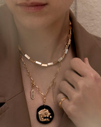この商品にはチャームクラスプが付いています。クラスプが開閉し、どのチェーンでも取り外したり取り付けたりできることを意味します。