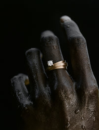 ロサンゼルスでリサイクルされたゴールドを使用して作られたこの作品は、つや消しサテン仕上げと爪留めのオーシャン ダイヤモンドが特徴です。
